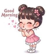 Adorable good morning cartoon illustration featuring a cute little girl blowing kisses with hearts, dressed in a pink outfit on a clean white background. Perfect for sweet morning greetings, kids-friendly designs, romantic messages, stickers, wallpapers, and social media posts.