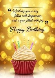 Happy Birthday Greeting Card with Cupcake and Candles on Golden Bokeh Background