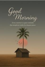 Minimalist good morning image featuring a serene sunrise, palm tree, and small wooden house in a quiet landscape with an inspiring quote about simplicity and peace. Perfect for image sharing on WhatsApp, Instagram, Facebook, and other social platforms to spread calm, positivity, and mindful morning vibes.