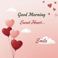 A soft and romantic good morning image featuring floating heart-shaped balloons, gentle clouds, and the text “Good Morning Sweet Heart… Smile.” This lovely pastel design is perfect for sharing affectionate morning wishes with someone special.