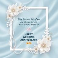 A beautiful Happy Wedding Anniversary greeting image featuring a soft blue background, elegant white floral decorations, and a stylish frame with pearls. The heartfelt message “May God bless both of you and fill your life with more love and happiness” makes it a perfect anniversary wish for couples. This graceful and romantic design is ideal for sharing wedding anniversary greetings with friends, family, or loved ones on WhatsApp, Instagram, Facebook, and other social media platforms.