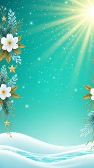 A dreamy winter fantasy scene with a turquoise to teal gradient sky filled with tiny glowing stars