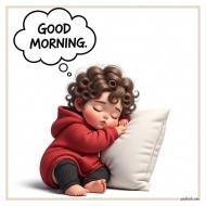 in a soft 3D/illustration style, with chubby cheeks and messy hair, leaning on a large white pillow
