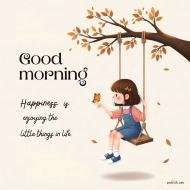 Cartoon style girl sitting on a wooden swing with good morning quotes