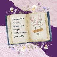 An open book with a quote on the pages that reads "Think positive thoughts because your thought patterns shape your reality" surrounded by small flowers on a pink and purple checkered background.