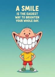 A cheerful cartoon illustration featuring a character with an oversized smile and the quote “A smile is the easiest way to brighten your whole day.” Perfect for positivity content, motivational posts, good-vibes graphics, kids’ designs, and uplifting social media visuals.
