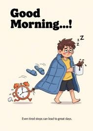 Humorous good morning cartoon illustration showing a sleepy boy wrapped in a blanket, holding a coffee mug, dragging a ringing alarm clock, with a motivational quote. Perfect for relatable morning greetings, funny social media posts, memes, wallpapers, and everyday lifestyle humor designs.