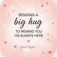A soft and comforting Good Night quote image featuring a pastel pink background with heart accents and the message “Sending a big hug to remind you I’m always here.” Perfect for expressing love, care, and emotional support before bedtime. Ideal for sharing with loved ones on social media, WhatsApp, or as a calming night message.