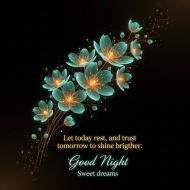 A beautiful Good Night quote image featuring glowing teal floral artwork on a dark background with an inspiring message: “Let today rest, and trust tomorrow to shine brighter.” This aesthetic night wallpaper radiates calmness, positivity, and hope, making it perfect for bedtime wishes, motivational posts, and sweet dreams messages on social media.