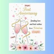 A beautiful first wedding anniversary greeting image featuring elegant champagne glasses, pastel flowers, and golden decorative ribbons. The message sends love and best wishes to a fabulous couple celebrating their first anniversary. With its soft romantic colors and charming design, this image is perfect for sharing anniversary wishes with couples on WhatsApp, Instagram, Facebook, and other social media platforms.