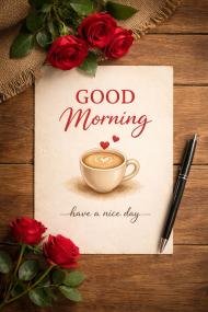 A beautiful and elegant “Good Morning” greeting card featuring a creamy latte with heart-shaped foam, surrounded by fresh red roses on a rustic wooden background. Perfect for sharing love, positivity, and warm wishes to start the day. Ideal for romantic messages, social media posts, and morning inspiration.