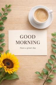 A bright and refreshing “Good Morning” image featuring a cup of coffee, a cheerful sunflower, and green leaves arranged on a wooden background with a positive message card. This nature-inspired composition symbolizes warmth, happiness, and a fresh start—perfect for sharing uplifting morning wishes.