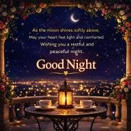 A dreamy Good Night image featuring a cozy balcony setting with glowing lantern light, two coffee cups, and a breathtaking city view under a starry sky and crescent moon. Framed with beautiful flowers, this image includes a soothing night message