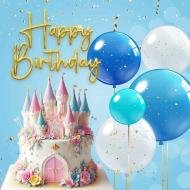 A happy birthday card with a colorful and festive background featuring a princess castle and balloons. the background is a bright blue with gold confetti scattered around, creating a cheerful atmosphere. on the left side of the image, a three-tiered white cake with a pink and blue castle-like structure, decorated with pink and gold flowers and a pink door, is placed on a white pedestal.
