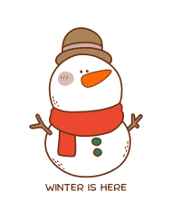 with a brown hat and red scarf, captioned 'Winter is Here'. Perfect winter season graphic for Christmas cards, holiday decorations, t-shirts, and festive designs.