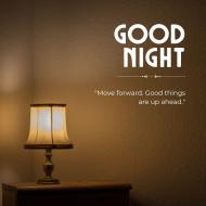 lit room with a simple wall and a lampshade casting a warm glow. the wall has a textured, textured surface with the words "GOOD NIGHT" written in white capital letters at the top, accompanied by a quote that reads "Move forward. Good things are up ahead.