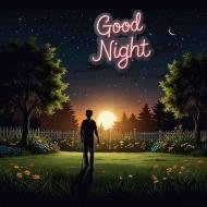 A silhouette of a person standing in a grassy field with Good night wishes