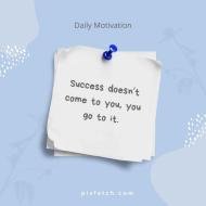A minimalistic flat design with a light blue background featuring abstract shapes and small white dots. on the center of the image, a single piece of white, torn paper pinned to a blue pushpin, with the text "Success doesn't come to you, you go to it."
