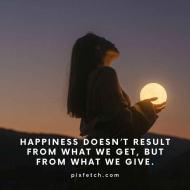 a silhouette of a woman holding a glowing full moon during sunset, with a text overlay that reads "happiness doesn't result from what we get, but from what give."